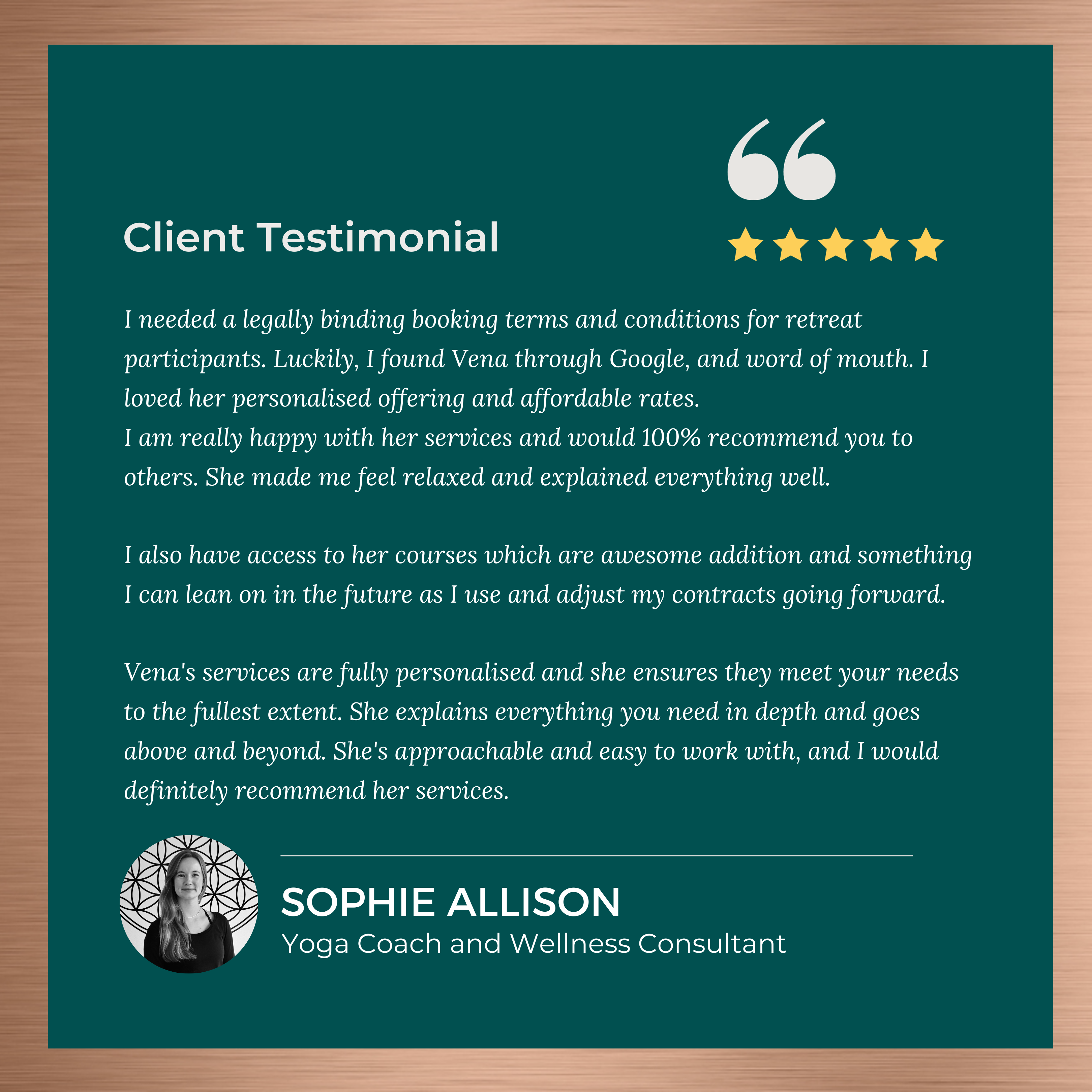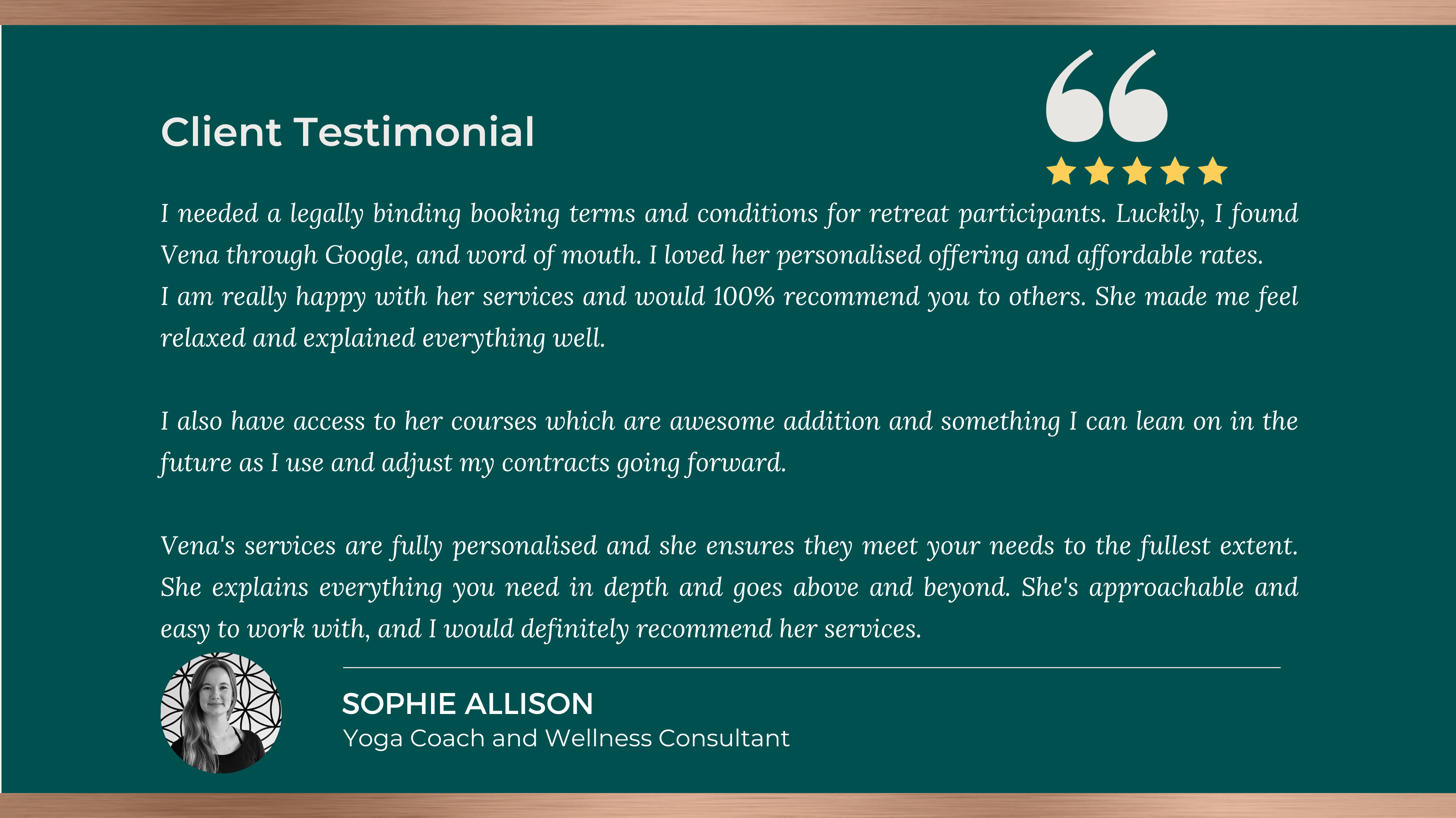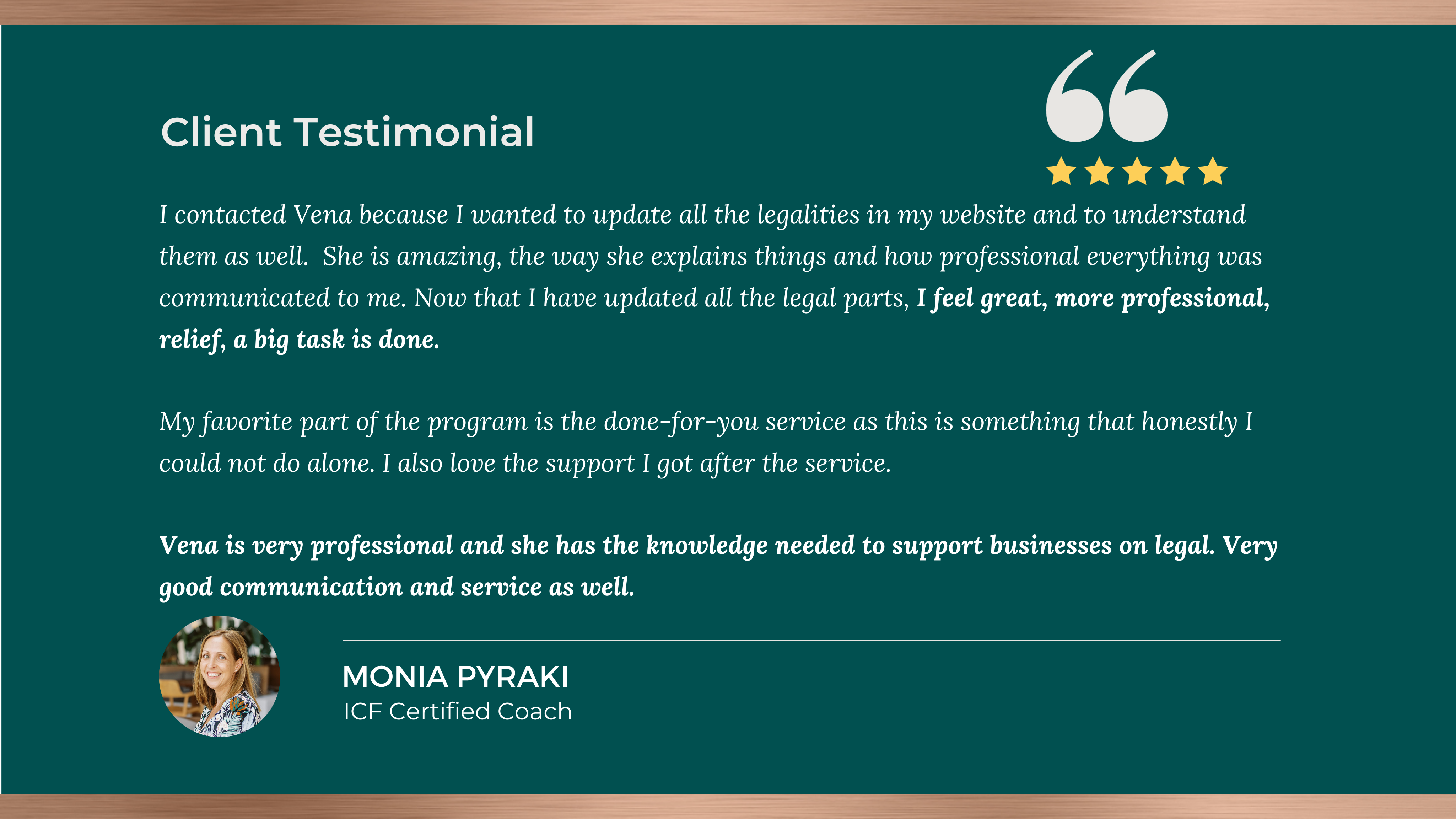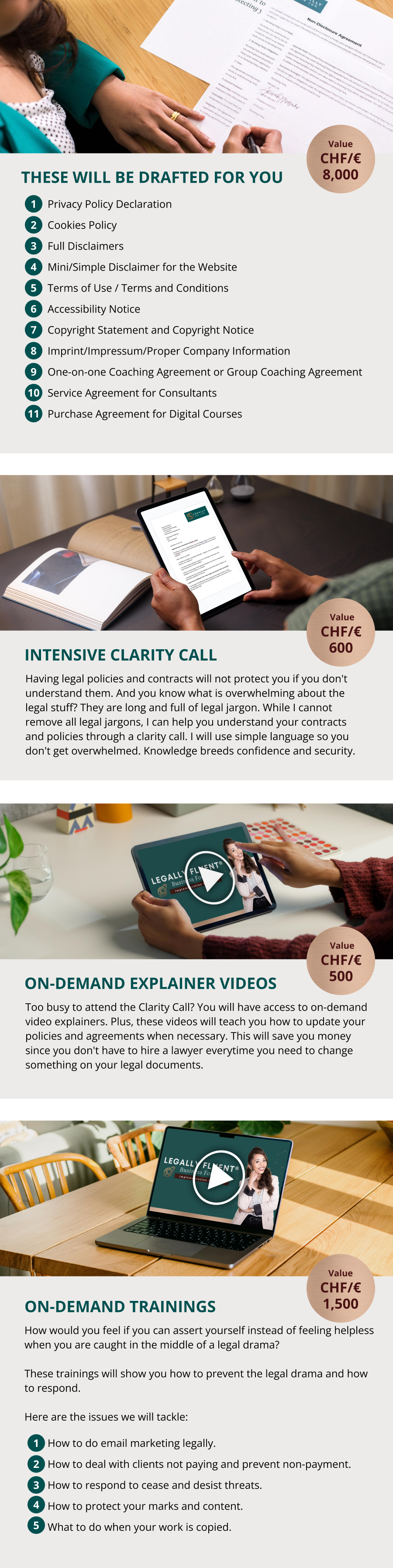 This done-for-you service is designed for busy coaches, consultants and experts who want to nail down their business legalities with very minimal effort on their part. You only need to spend 35 minutes to answer the questionnaire and a 60-90-Minute Intensive Clarity Call with me, so I get to explain your policies and contracts provision by provision.