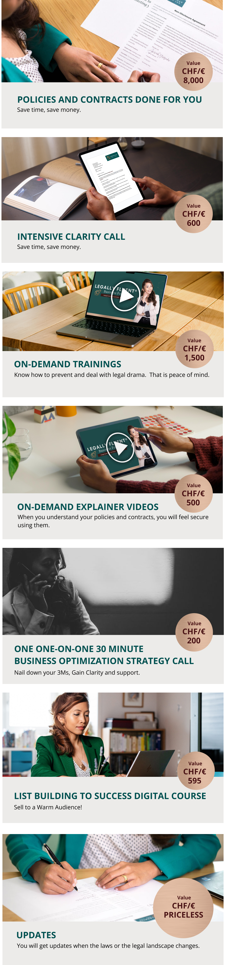 I won't leave you to blindly implement things on your own. That's why we've included on-demand training on how to avoid, prevent and deal with the legal drama. You can access this anytime you want. But here's the exciting part: This isn't just any ordinary training. I've carefully crafted it based on real-world business practices, not just textbook legal advice. By running a compliant business, you can grow and expand without fear.