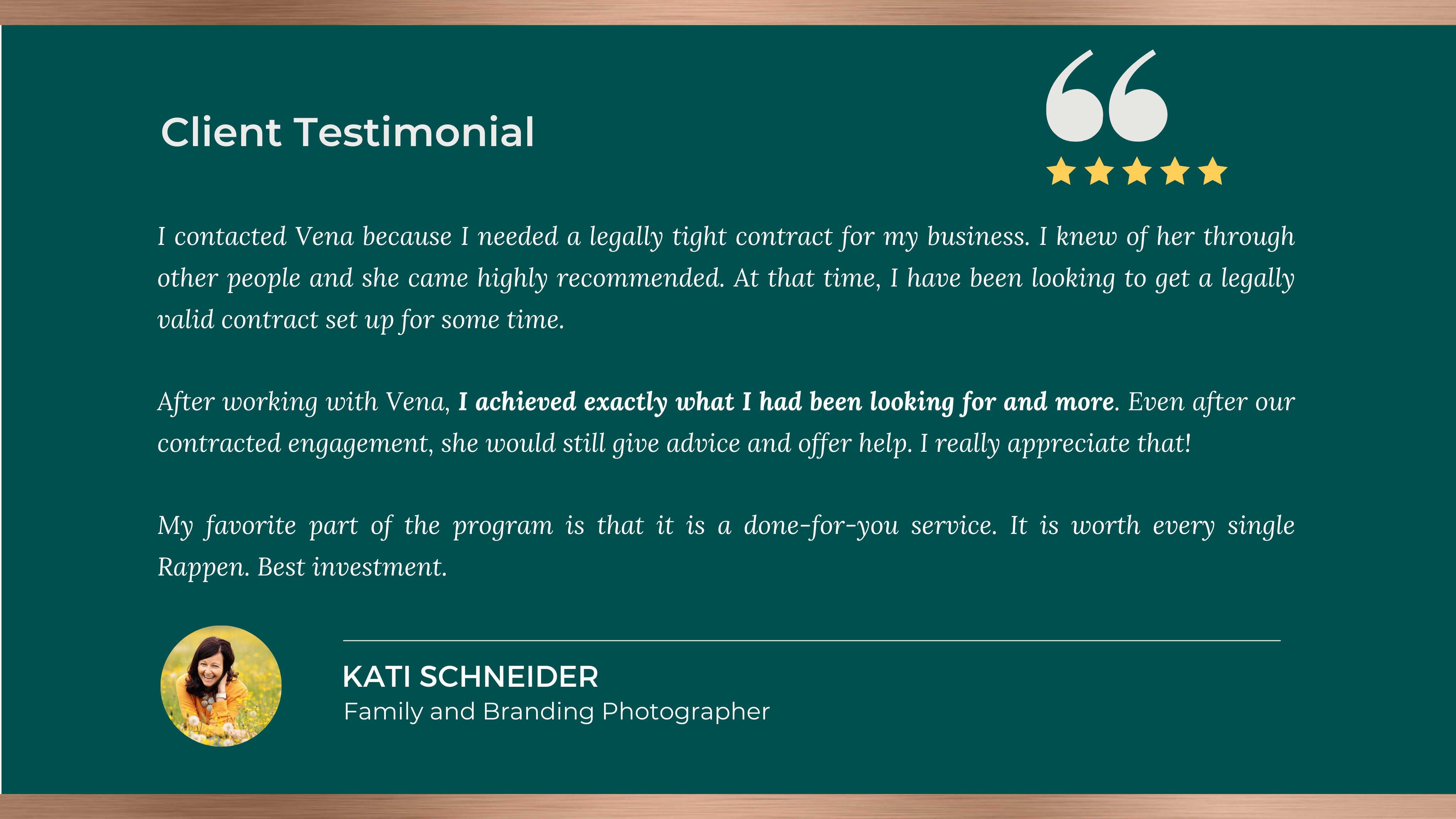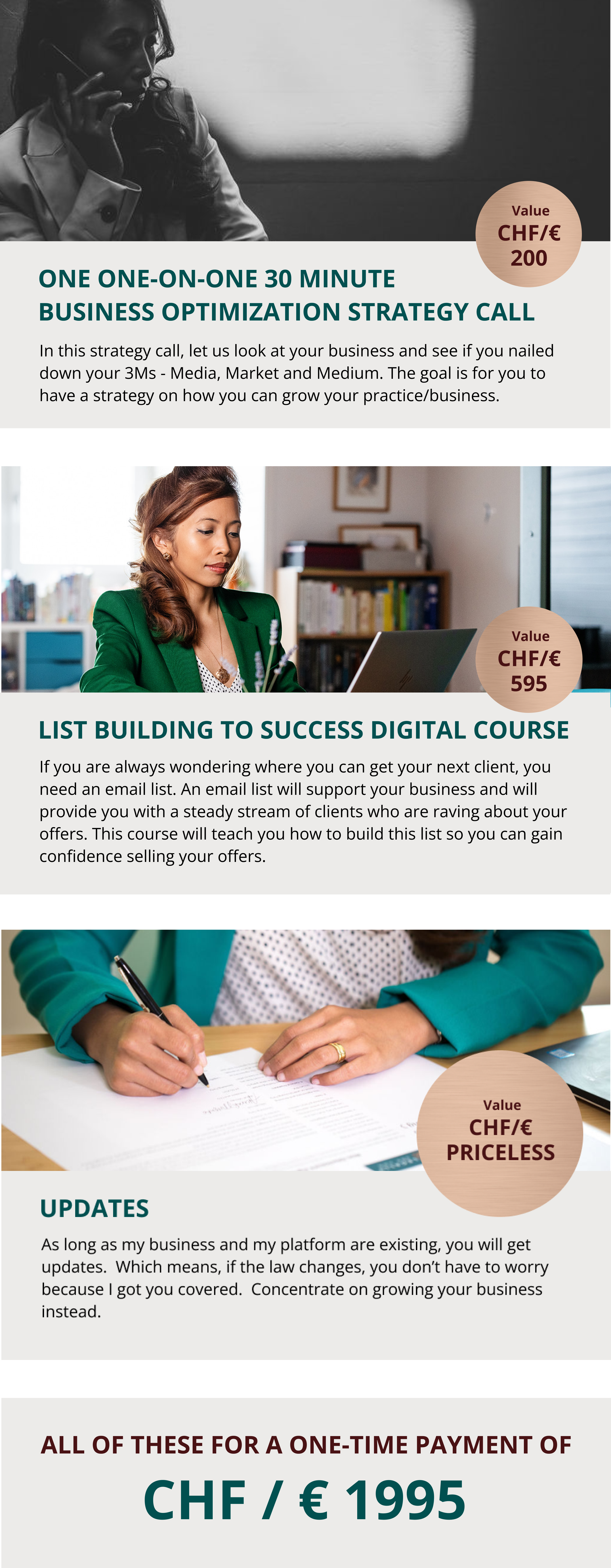 You need to be able to leverage your business legalities. Hence, part of this program is a thirty-minute strategy call with me. Let's look at your business, your goals. Formulate a plan how you can reach those goals.