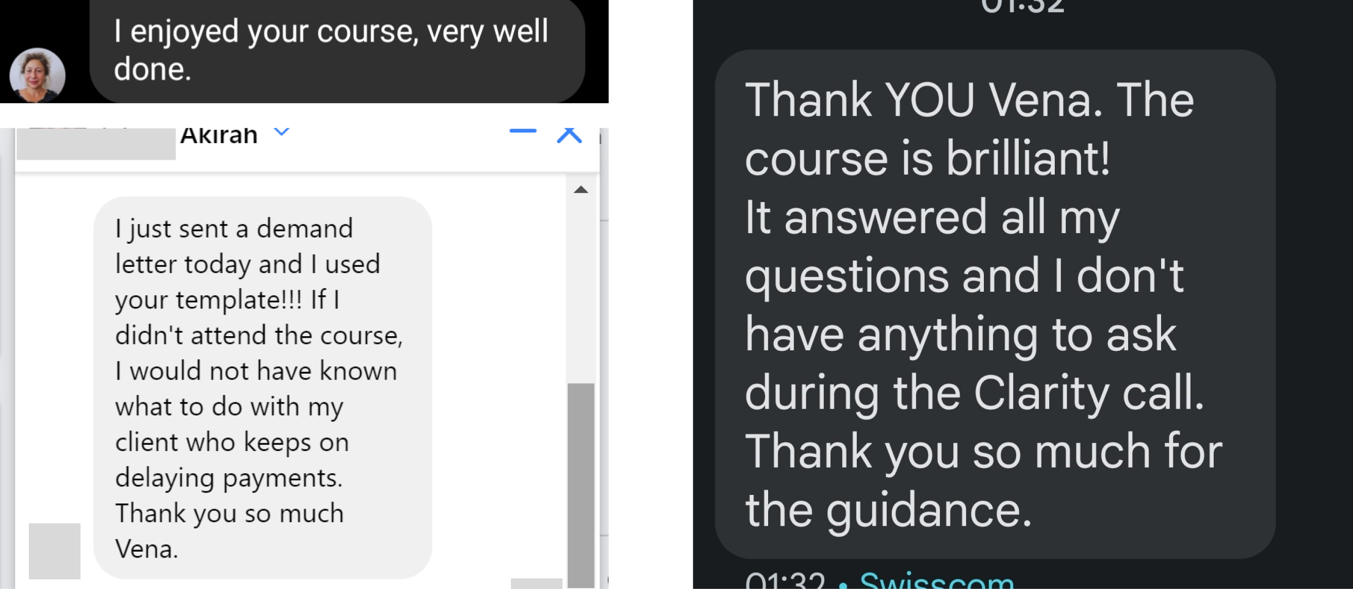 Can't join the call? You will get access to my Website, Legal Drafting and Contracts Courses, so you can watch the on-demand training videos which will explain the basic provisions and how to respond in case you are in the middle of a legal drama.